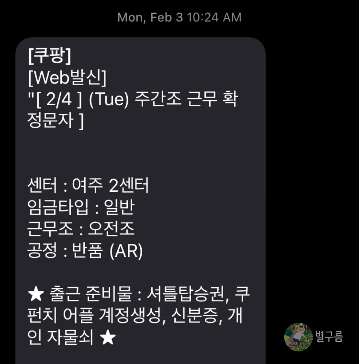 토요일에 근무하려고 쿠펀치로 예약을 했는데하루 전날 근무 확정 문자를 받았다.지난번엔 오전 10시 24분 이번엔 오전 10시 54분에 문자가 왔다. 배정된 공정이 시설관리면 고민을 좀 했을 거 같